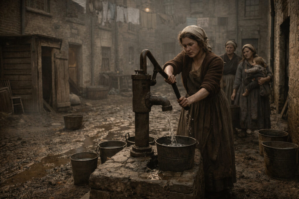 Water came from the pump in the yard, two flights down and out the back. Sarah made that trip a dozen times a day—water for cooking, water for washing, water for the children. The yard pump served all the families in their building and the ones in the buildings on either side, so there was always a line in the morning, women with buckets, trading news. The yard itself was packed dirt, churned to mud when it rained, with a shared privy in the corner that serviced more people than it was ever meant to.